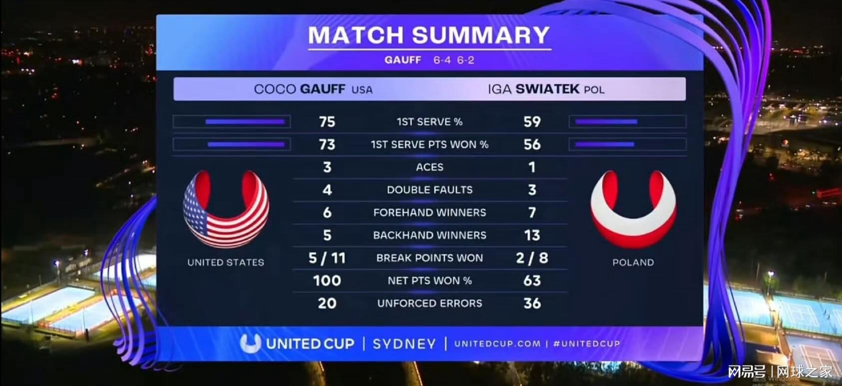 第二盘高芙连续破掉斯瓦泰克两个发球局,取得5-0的开局。第7局斯瓦泰克化解赛点破发,局分追到2-5。第8局高芙再次实现破发,6-2赢下第二盘,连续第四次击败这位自己的前“克星”。